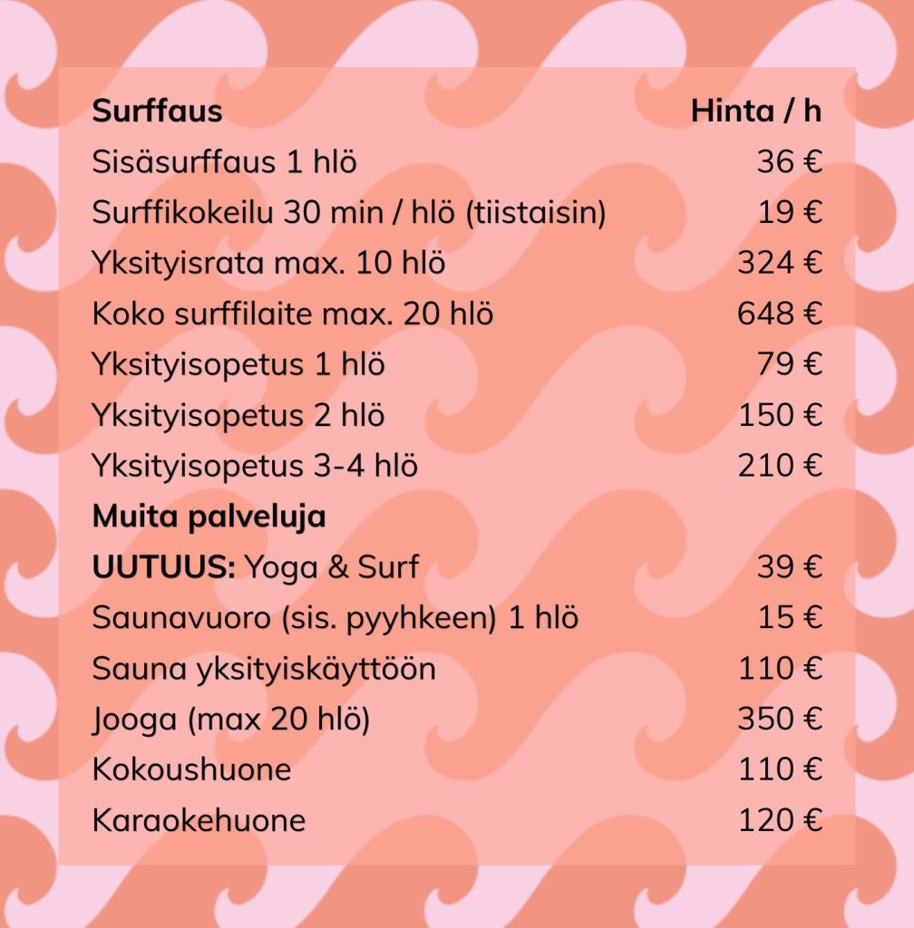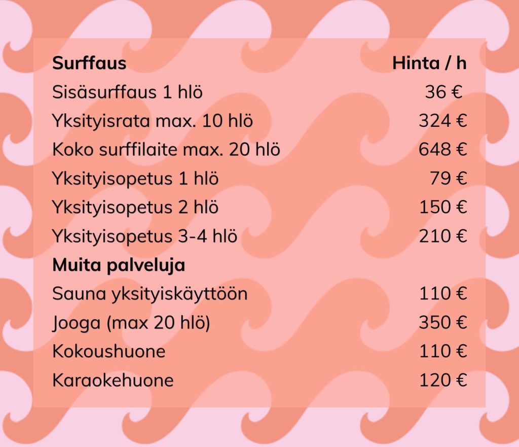 HUOM! Kokeneiden surffareiden osallistumista aloittelijoiden surffaustunneille ei suositella tasoeron ja vauhdin vuoksi.